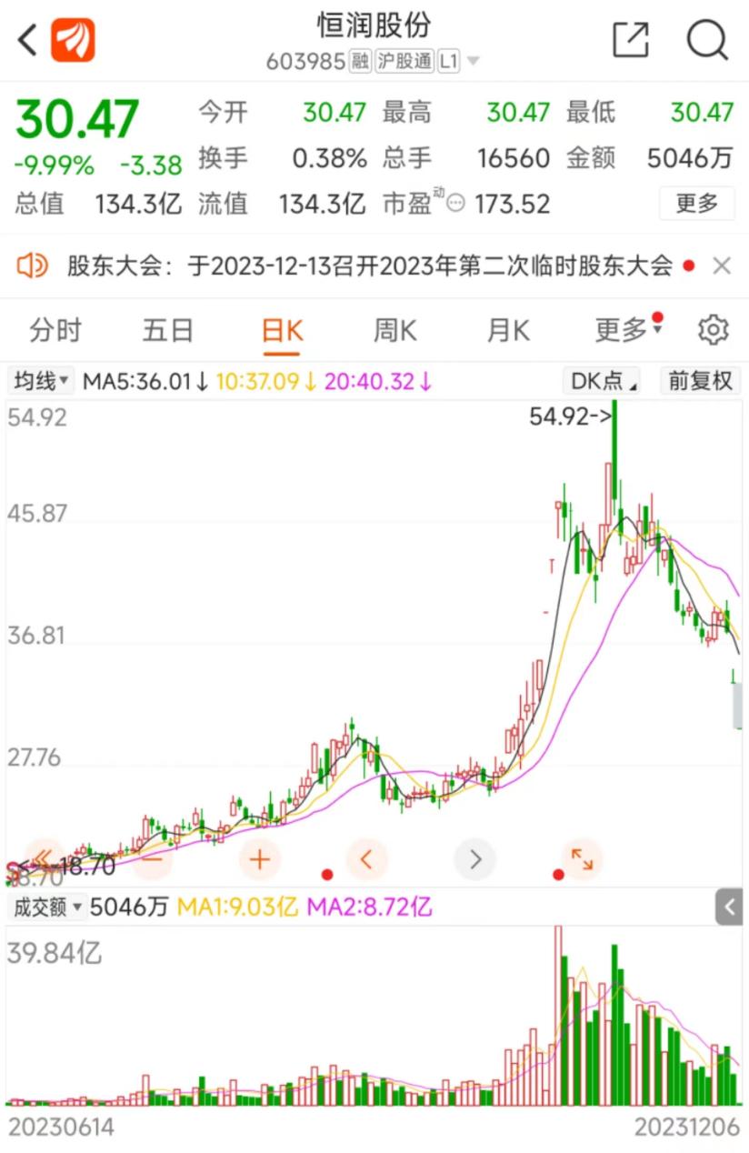 12月6日,恒润股份全天一字跌停,截至收盘,仍有33.91万手股票在卖一位置等待出售,因当日封跌停板,仅成交0.5亿元。该股已连续三日下挫,上一交易日几乎全天跌停,近三个交易日跌幅达21.95%。
