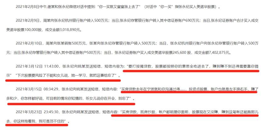 12月4日,福建证监局披露处罚决定书,因内幕交易美诺华股票,该公司董事长姚某前妻张某被“没一罚二”,合计罚没3303.85万元。该案引起市场广泛关注,张某与姚某离婚20年,张某账户买入美诺华股票大部分资金来源于姚某,系由周某代姚某以离婚补偿款的名义支付张永纪2500万元。案涉期间,张某居住在美诺华全资子公司名下房产,与姚某宁波住所在地理位置上处于同一电梯位,两住所位于隔壁和对门。姚某称其每月向张永纪支付约10万元生活费。
