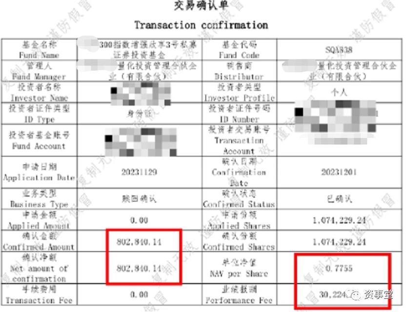 资事堂与相关产品方进行了确认,这位高净值客户的图片信息(交易确认单)属实。