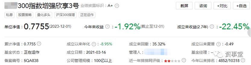 值得注意的是:上述产品的管理人是一家大型量化私募机构,资产管理规模超400亿元。