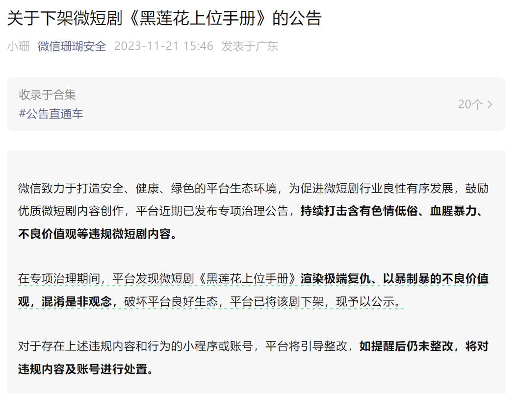 11月21日,微信官方宣布现象级短剧《黑莲花上位手册》下架。官方公告称,在专项治理期间,平台发现微短剧《黑莲花上位手册》渲染极端复仇、以暴制暴的不良价值观,混淆是非观念,破坏平台良好生态,平台已将该剧下架,现予以公示。