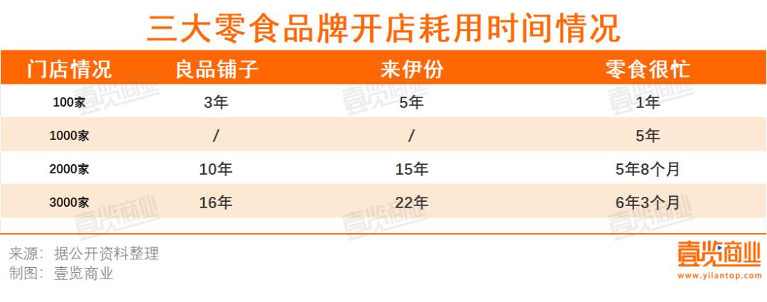 零食很忙自2017年首家店开业后,开业速度一直被行业关注。从1到1000只用了5年时间,自门店突破1000家后,便开始了拓展提速。从1000家到2000家只用了8个月,2000家到3000用了7个月。而传统零食连锁品牌来伊份和良品铺子从1到3000,分别用了22年和16年。