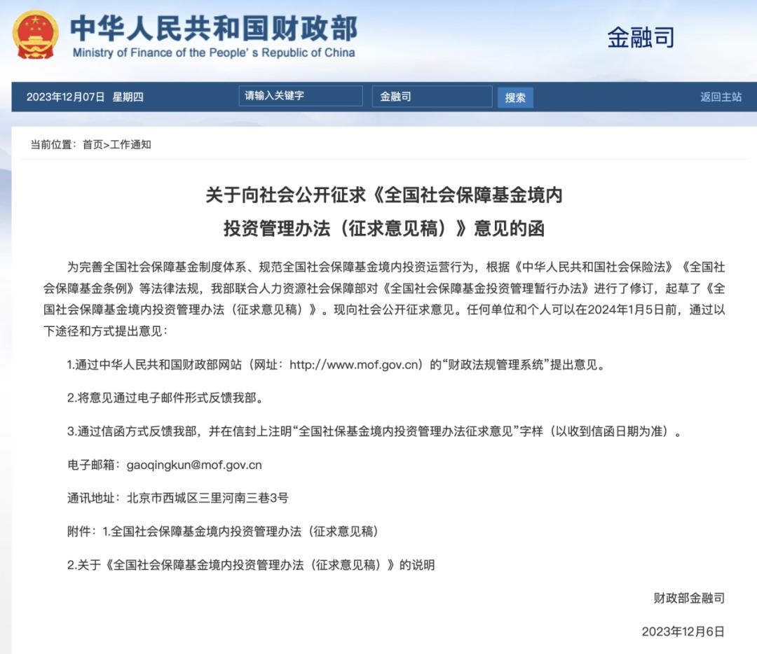 投资界—解码LP获悉,近日,财政部联合人力资源社会保障部发布《全国社会保障基金境内投资管理办法(征求意见稿)》(下称《管理办法》),向社会公开征求意见。