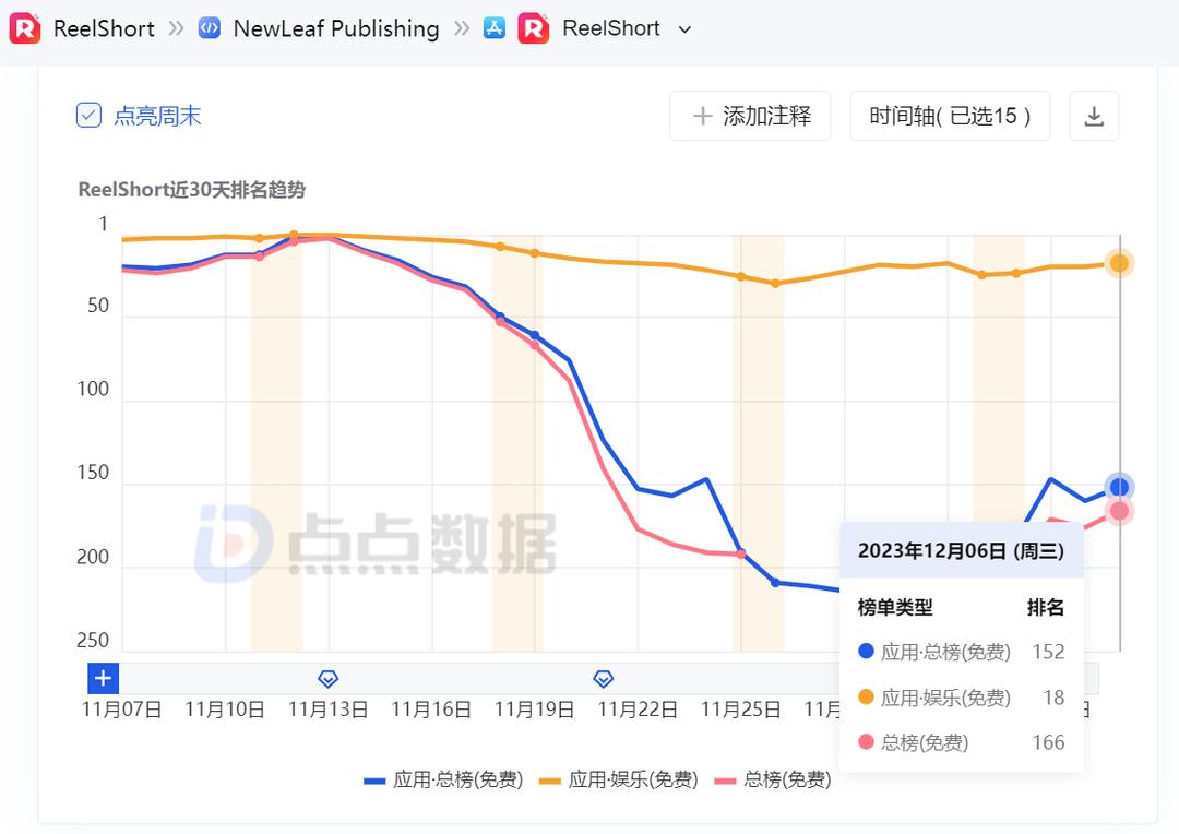 据移动数据分析平台“点点数据”统计,11 月 12 日,ReelShort 在美国 iOS 娱乐类免费应用中下载量一跃至榜首;截至 12 月 6 日,排名为第 18 位。