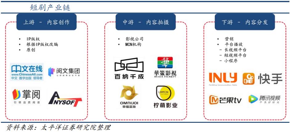 短剧的火热在海内外同步上演,剧本是类似的爽文套路,且二者产业链构成基本一致:上游内容创作,中游内容拍摄,下游内容分发。