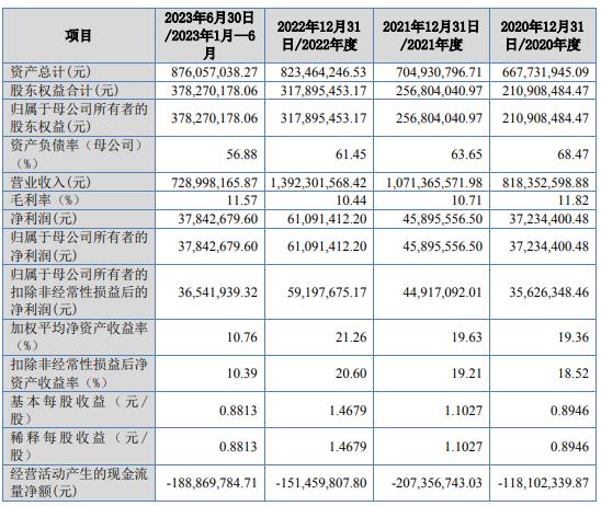 但不可否认的是,由于日常经营无法收到现金,公司应收账款余额正在逐年扩大。数据显示,2020年至2023年上半年(以下简称“报告期内”),公司应收账款余额分别为1.66亿元、2.18亿元、2.70亿元、3.47亿元,占营业收入比例分别为20.29%、20.35%、19.40%、47.60%。