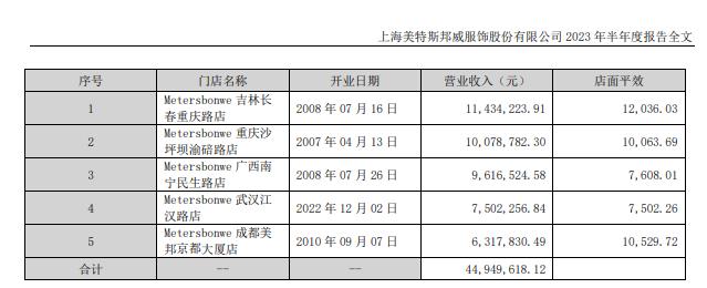 美邦服饰在2023年半年报中提到,成都美邦京都大厦店(即春熙路美邦大厦店)报告期内营收631.78万元,在所有门店中排名第五。