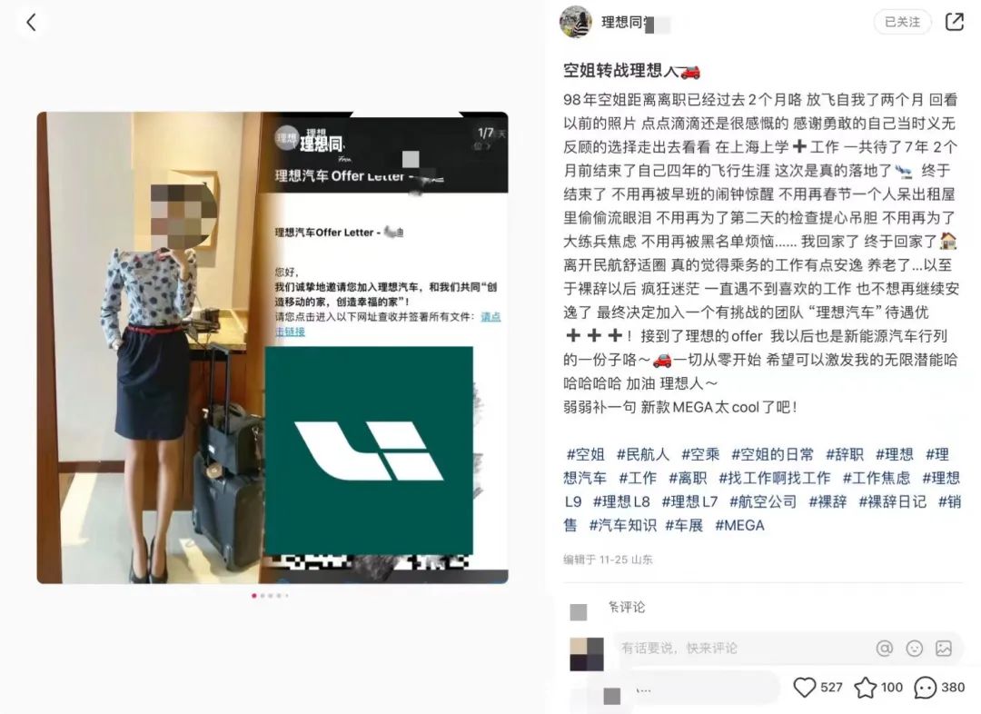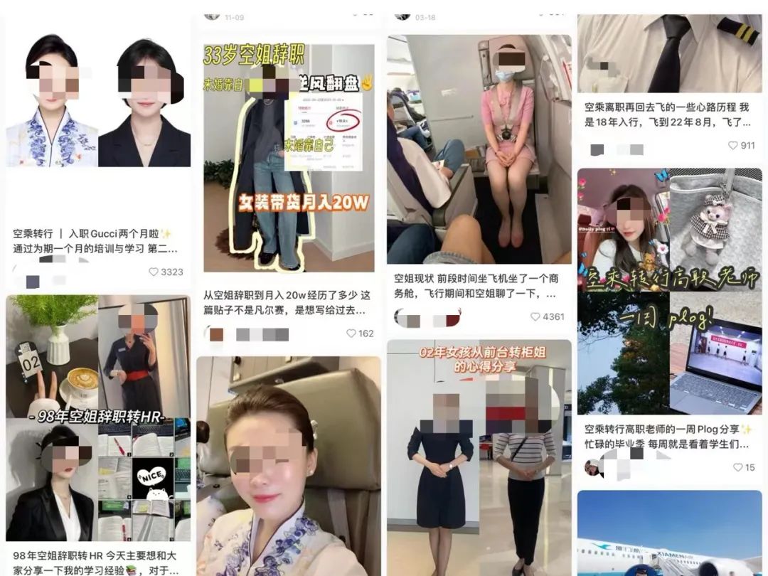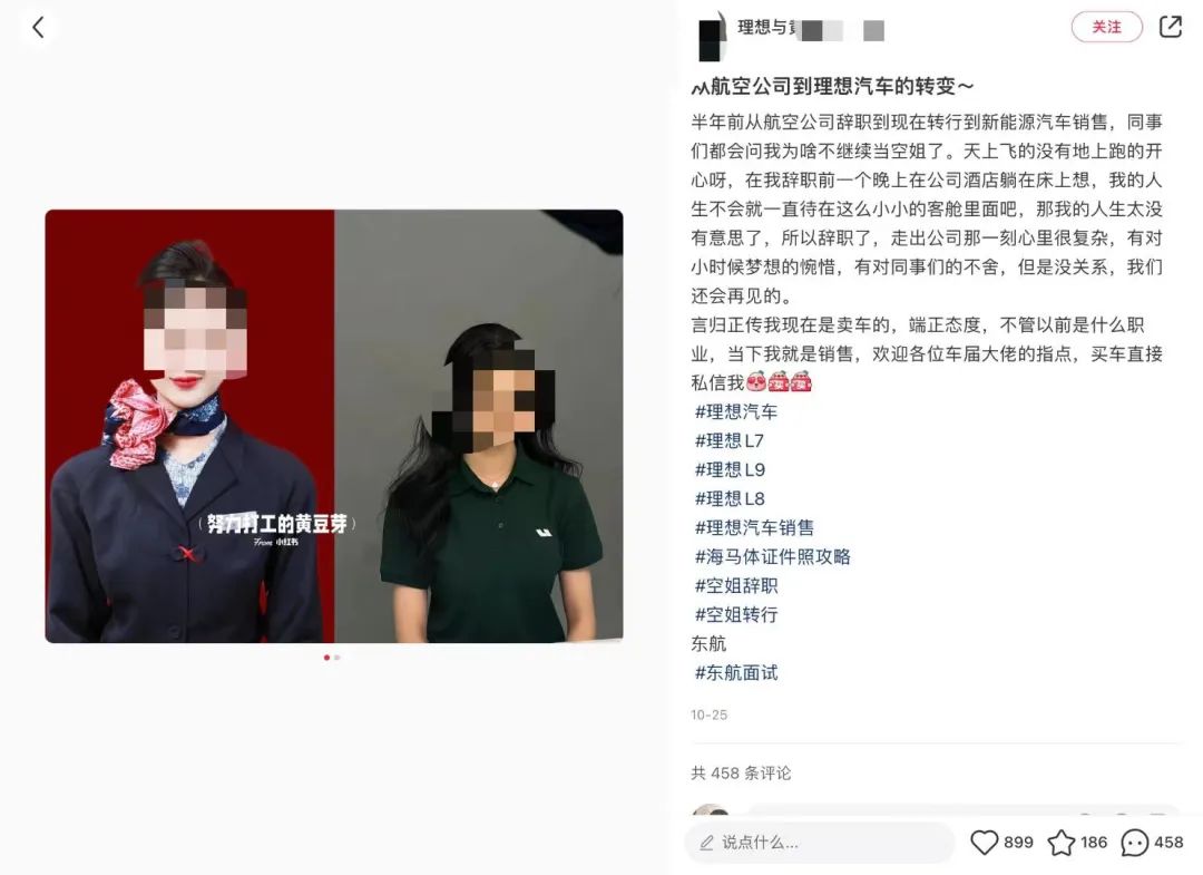 在小红书上,有很多关于空姐转行的帖子,当然不止汽车销售,还有奢侈品销售、带货、转行HR,还有当老师的。