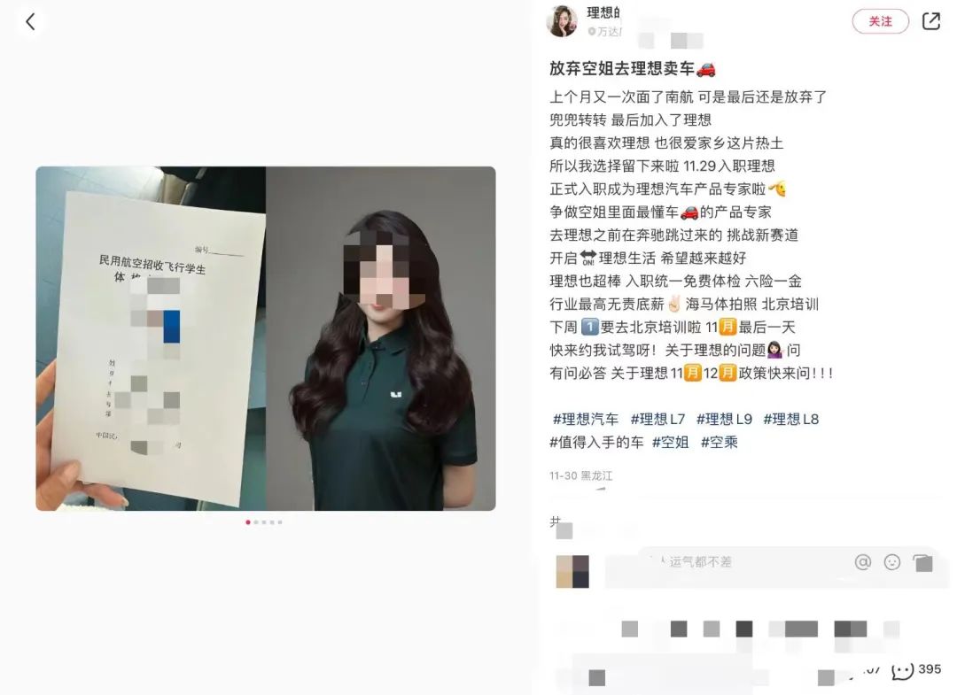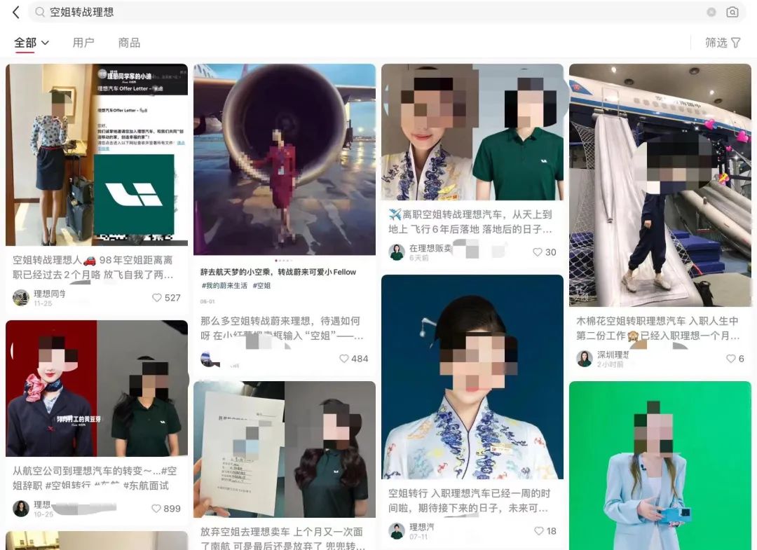 其中尤其以蔚小理等新能源汽车品牌居多,而在蔚小理中理想相关的帖子最多,我们很容易就会搜到“空姐转战理想”的话题。