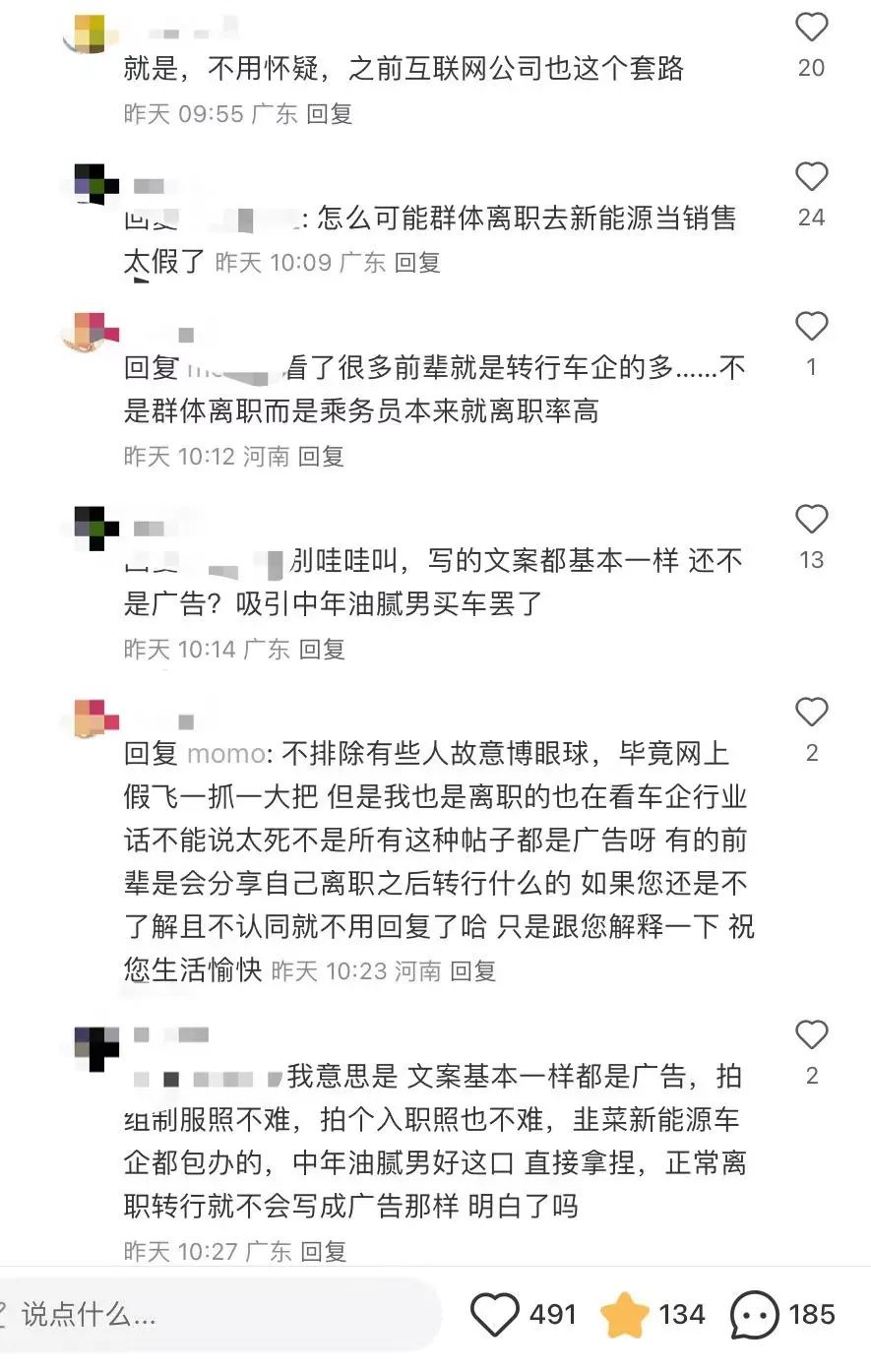 更有网友直言,这就是新能源汽车的广告,吸引油腻男。确实很多文案都是大概的套路,一张空姐制服照再配上些转战某某的文字,欢迎找她买车,营销味十足。