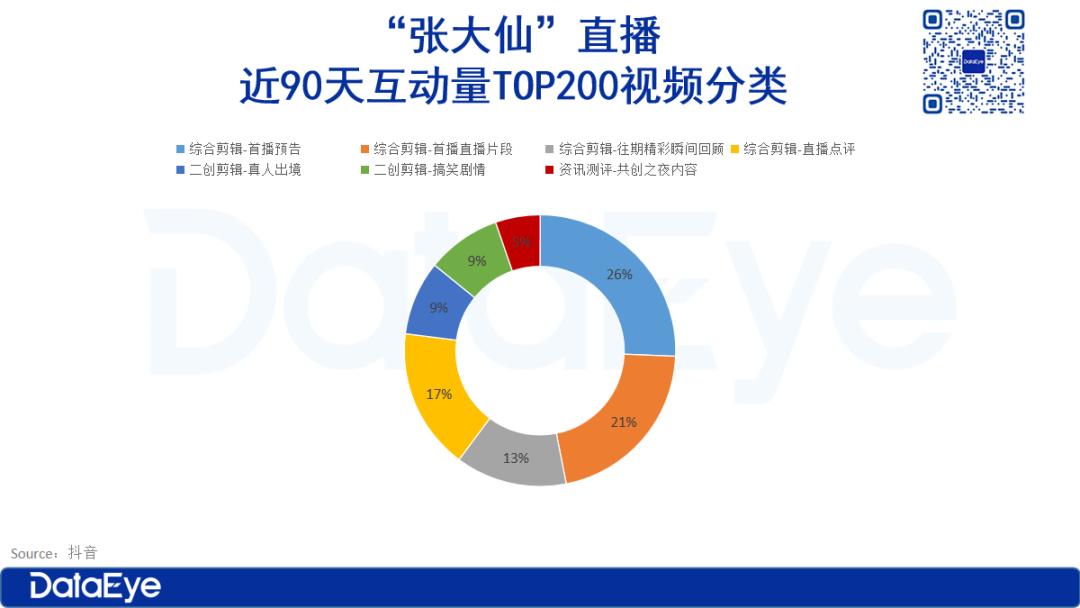 DataEye研究院统计了近90天以来与“张大仙”相关的TOP200互动量(赞转评收藏)的抖音视频类别,除去作者本人发布的76条视频内容,我们将其余视频内容进行了分类,可以看出种类多元。