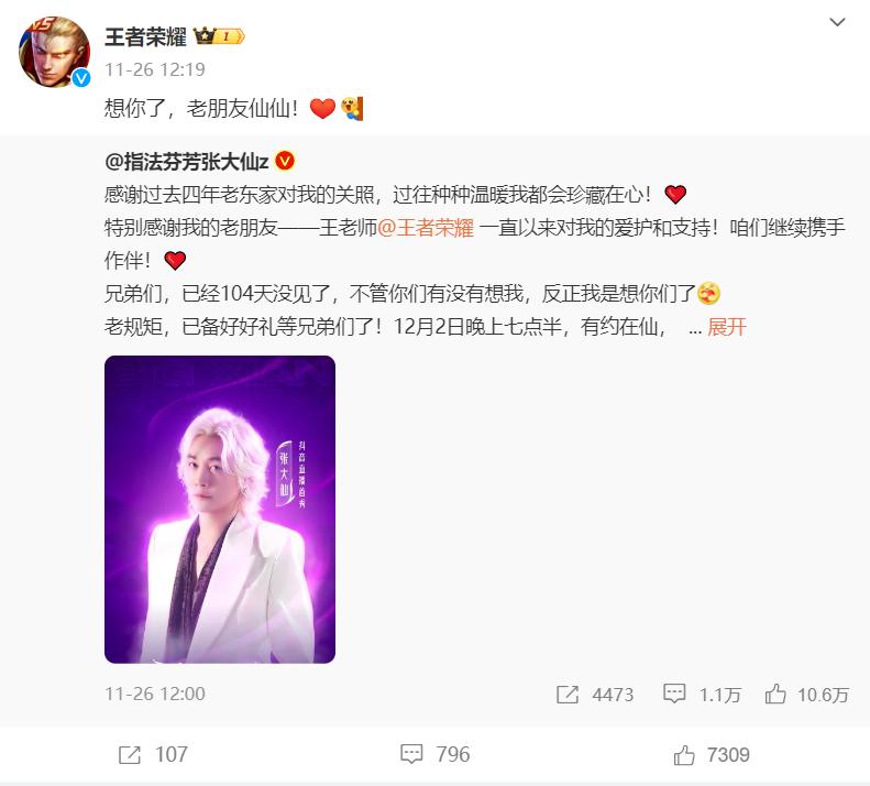但是,抖音没有《王者荣耀》的直播版权,似是早已预料到跳槽抖音会引起的疑惑,张大仙发了微博,关键信息是:会继续与王者荣耀为伴,而王者荣耀官方也转发了他的微博并称:想你了,老朋友仙仙!