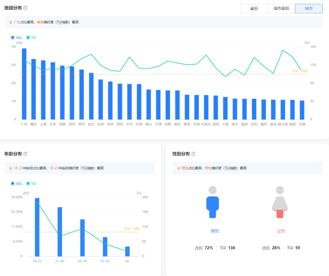 根据巨量算数数据显示,抖音“@张大仙”的关注粉丝,以年轻男性用户居多:年龄方面18-23岁占比33.66%,31-40岁占比28.38%。性别方面,男性用户占比72%。他们主要分布在一线或新一线城市。