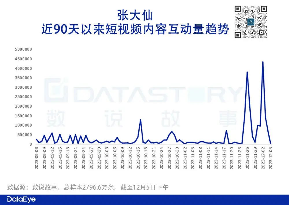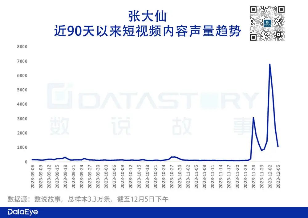 声量方面:截至12月5日,关于“张大仙”相关的短视频内容条数约为3.3万条,从时间维度来看,声量爆发主要集中在两个时间段,①11月26日“张大仙”官宣抖音直播首秀时间;②12月2日抖音开启直播首秀。