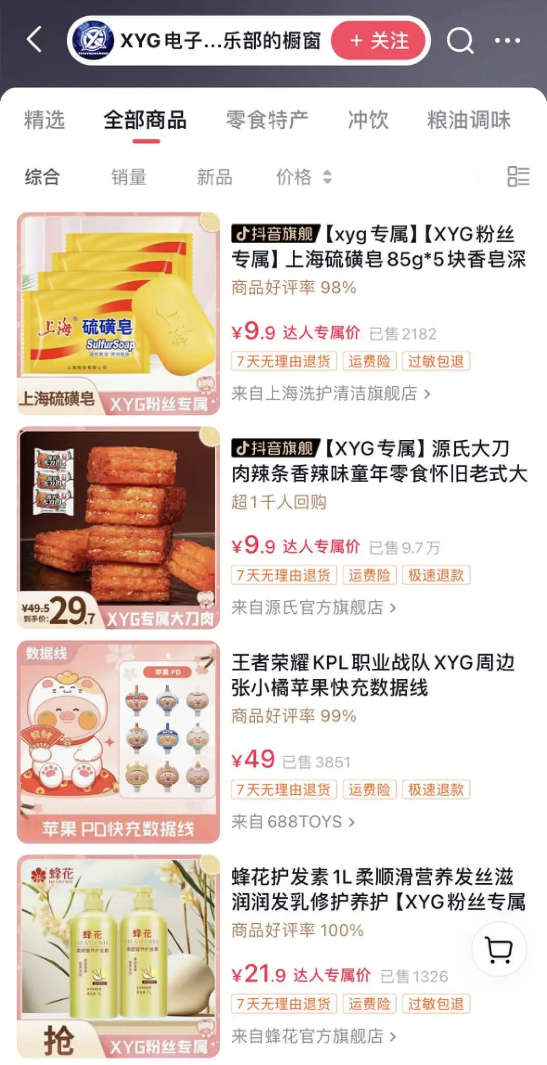 与此同时,张大仙的电竞战队XYG就开始与今年“网红”的国货品牌互动,包括蜂花、汇源、满婷、白玉等品牌,在XYG战队的抖音橱窗也挂上了吃胖大仙的“大刀肉”,以及上海硫磺皂、汇源果汁、白玉牙膏、卫龙辣条、钙奶饼干等一系列打着“XYG粉丝专属”的促销产品。