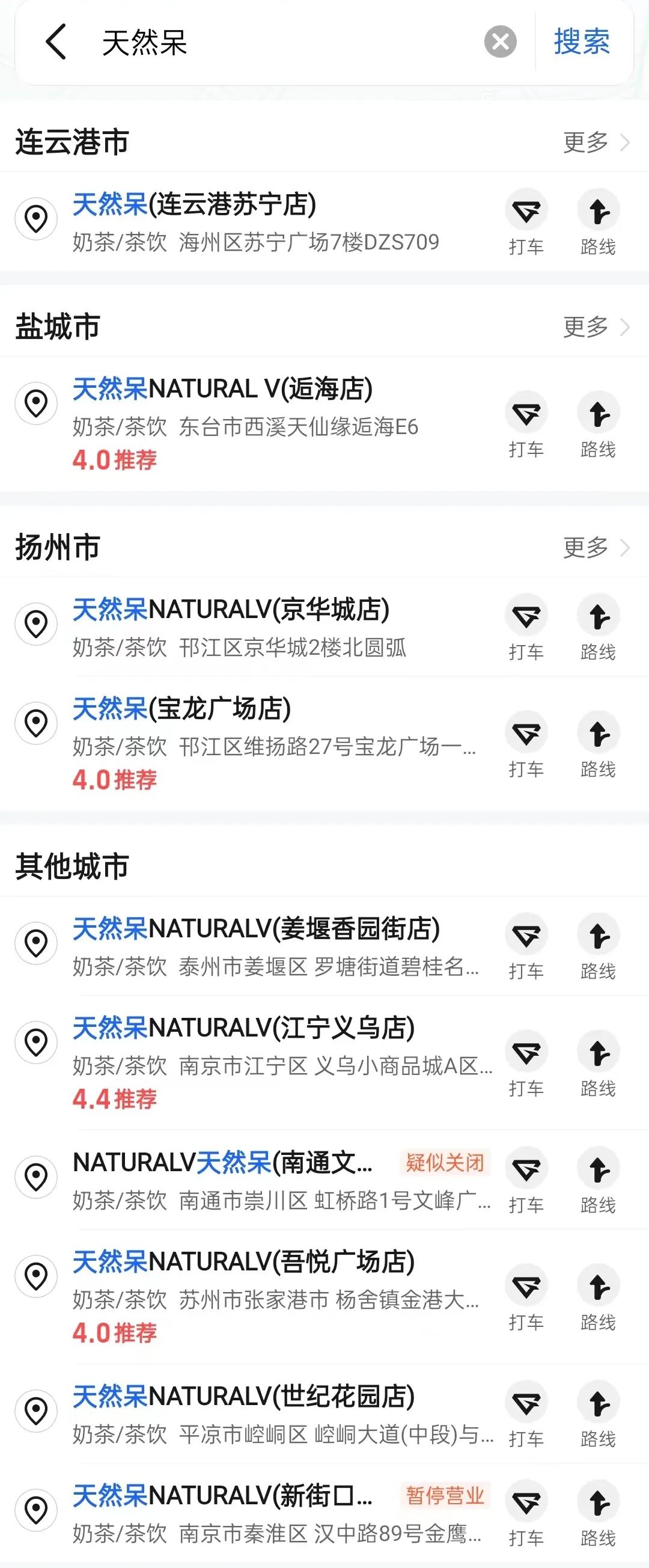值得关注的是,今年5月,天然呆被曝出大量关店。今日,据中食财经查阅高德地图发现,未显示“暂停营业”的天然呆门店仅存8家,且全部门店均未显示用户评价等消费痕迹,其中3家门店,高德上提醒地点服务状态可能发生变化,疑似关店。美团上则显示仅有盐城和扬州的3门店仍在营业。