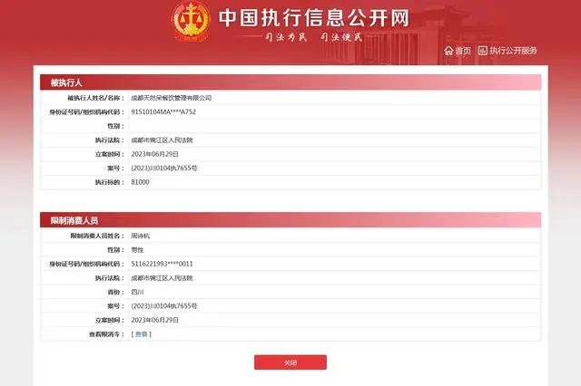 中国执行信息公开网显示,近日,天然呆公司及法人周诗杭新增一则限制消费令。申请人为胡某某,涉及知识产权合同纠纷案件。天然呆奶茶公司因未按执行通知书指定的期间履行生效法律文书确定的给付义务,该院对天然呆奶茶公司采取限制消费措施,限制公司及公司法定代表人周诗杭不得实施高消费及非生活和工作必需的消费行为。