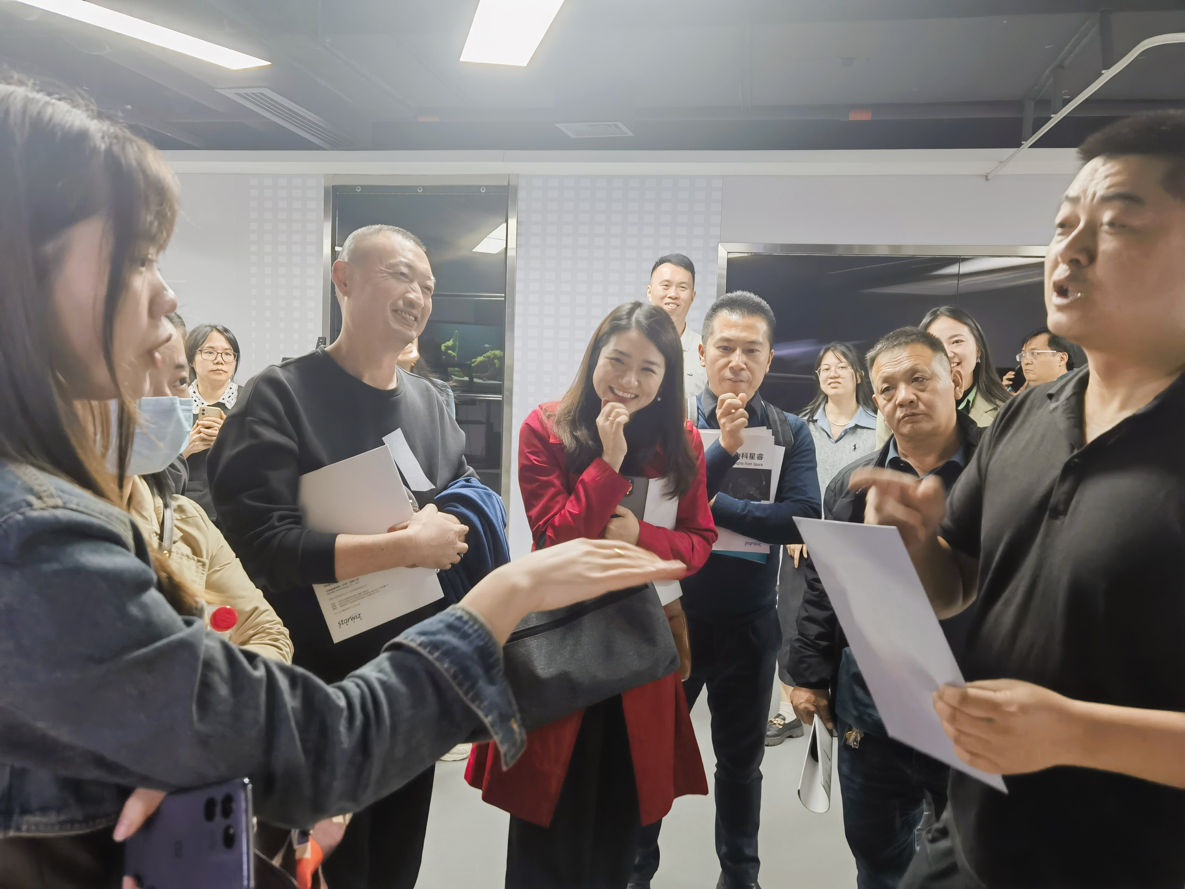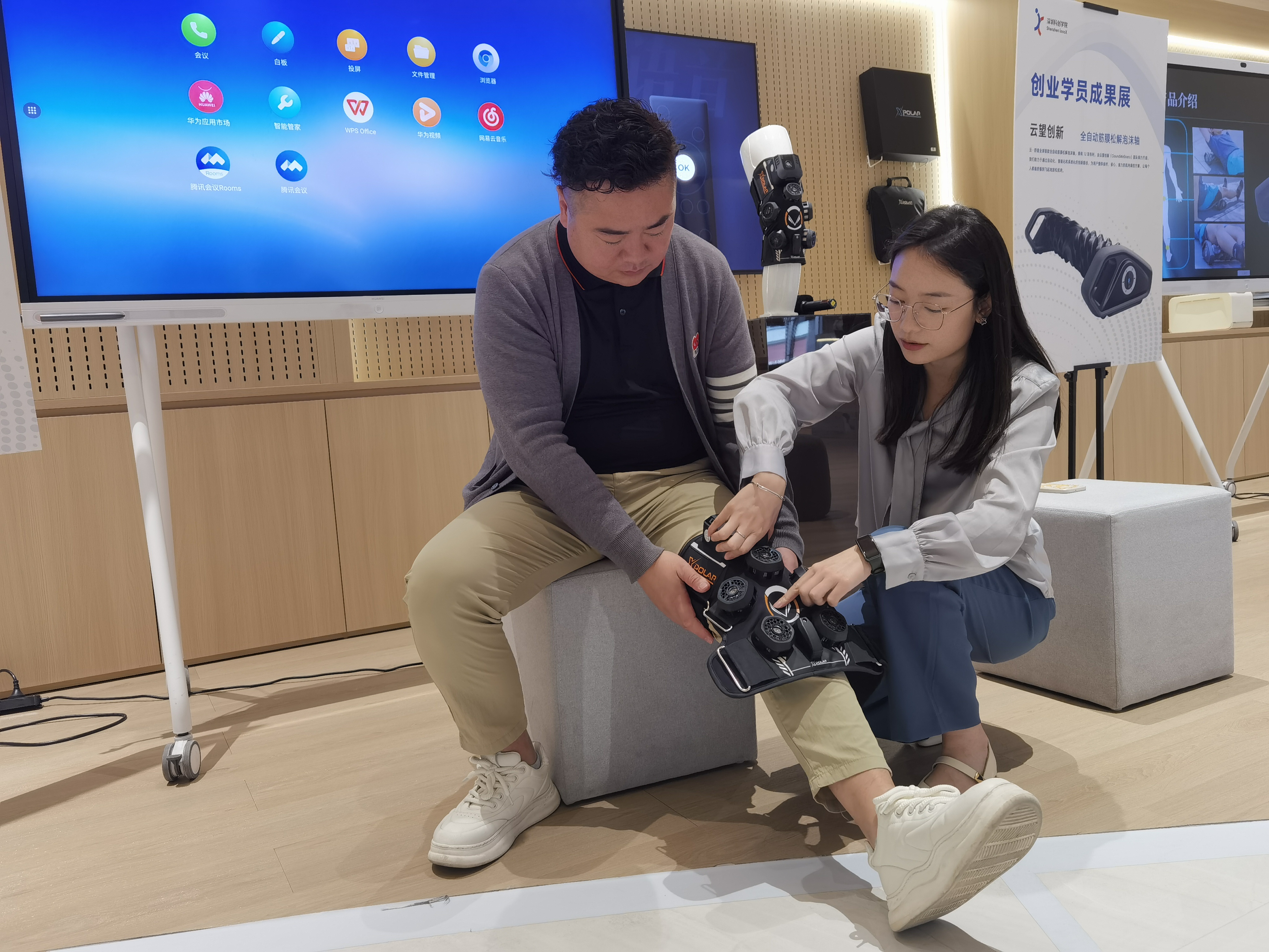 在学院负责人的陪同下,学员们参观了科创生态主展厅、供应链展厅等,体验了月销过万的未知星球无弦吉他和尚未正式面市的智能运动、康复产品。