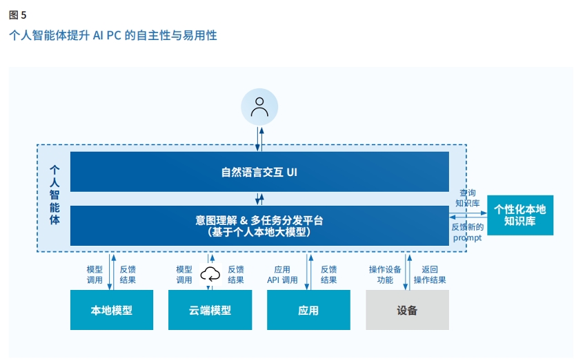与此同时,在AI PC的推动下,PC产业生态将发生颠覆性的变化。以人为本、终端主导和AI原生之下,传统PC产业以操作系统为基础,用户在系统界面中直接进行操作,并管理和运用应用程序的生态将被改变;取而代之的,是个人智能体作为用户通向AI功能的集成化入口,在大模型与应用生态的支持下,完成用户端提出的任务。