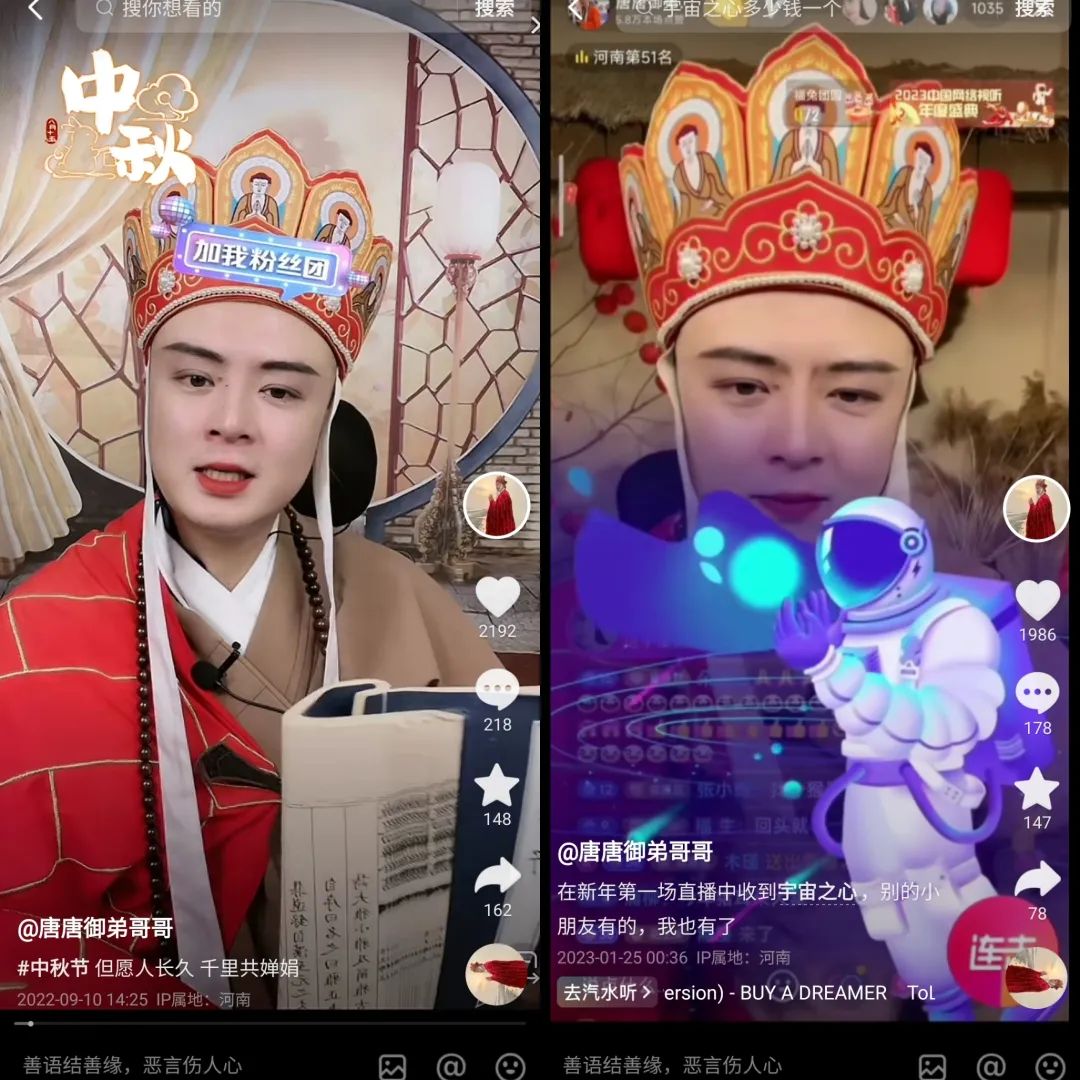 这位唐僧扮演者名叫田向阳,早在2020年便以“唐僧”的形象出现在短视频和直播间中,截至今年10月底,其抖音账号“唐唐御弟哥哥”积累了66万粉丝。