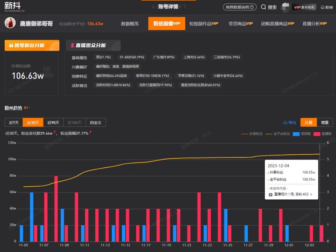 田向阳表示,身边开始有朋友刷到自己,他意识到自己可能火了。新抖数据显示,“唐唐御弟哥哥”近一个月涨粉近40万,截至发稿前,其账号粉丝量超106万。