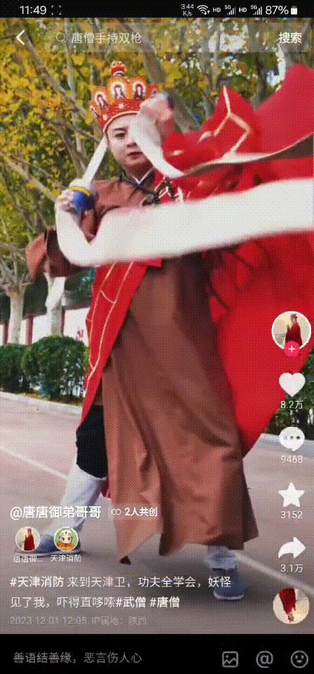 近期,他和“天津消防”官方账号联动拍摄了多条公益视频,以“唐僧”的身份为消防安全做宣传。