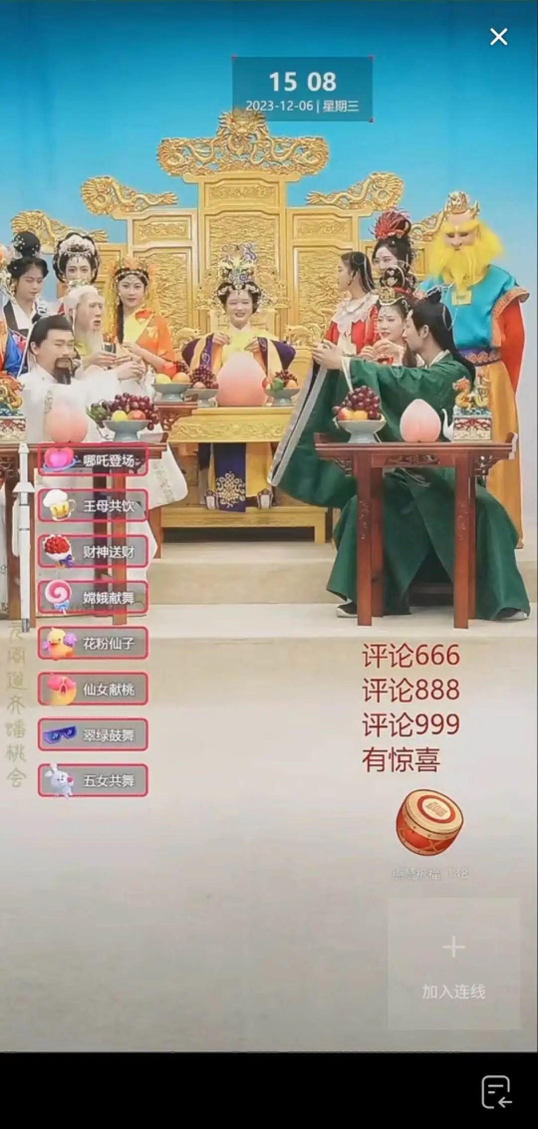 比如账号“慈元阁道齐蟠桃会”还原了电视剧中“天庭”的场景,在仙气飘飘的直播间里,哪吒和嫦娥等诸位“仙家”轮番登场展示技能,背景的旁白音还不忘提醒观众:“众位仙友,点点关注列为仙班。”