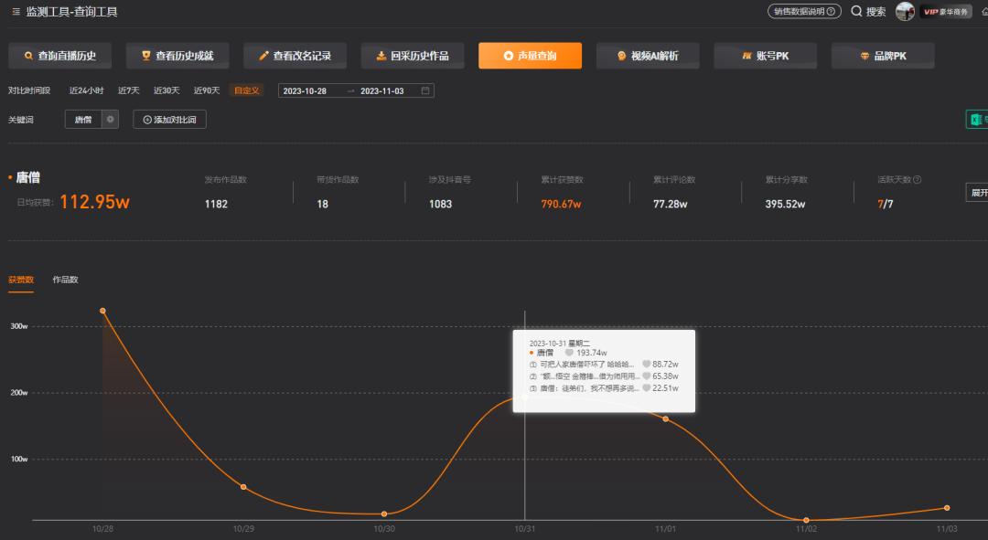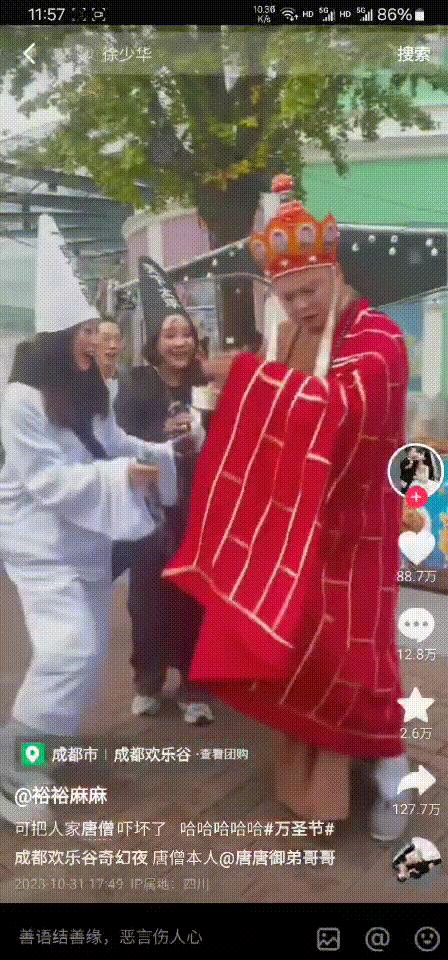 新抖数据显示,10月29日至11月3日,在万圣节前后的5天里,“唐僧”相关内容日均获赞超112万,其中多条视频的主人公是田向阳扮演的唐僧,10月31日由网友“裕裕麻麻”拍摄的一条视频获赞达88万。