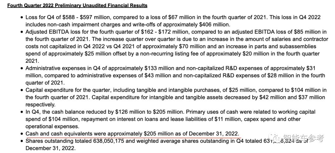 其次是多次面临资金链断裂风险。3月,Arrival公布了2022年第四季度的财报。财报显示截至2022年12月31日,公司现金和现金等价物只剩2.05亿美元(约14.95亿元)。