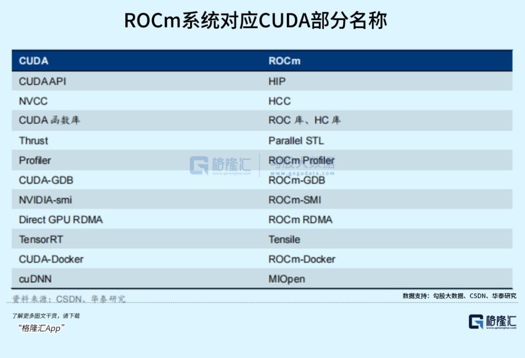 AMD的生态是ROCm,主要客户是一些研究机构,相比CUDA已经能够广泛支持英伟达多条产品线,ROCm目前仅支持Instinct 系列GPU的部分SKUs,包括Radeon Pro W6800和 Radeon Pro V62。