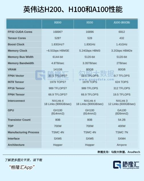而近期英伟达发布的H200作为对MI 300的回应,重点也在内存带宽上进行了升级。H200拥有高达141GB的显存,带宽则从3.35TB/s增加到了4.8TB/s,内存容量上超过了MI 300的128GB,带宽按照H100的1.6倍则稍微逊色于MI 300。