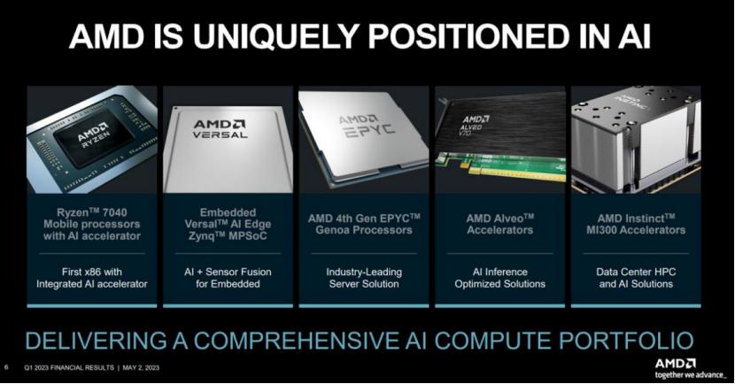 正因为AMD较早地完成了对两种处理器芯片的布局,在AI大模型加速普及,未来能够塞进各种智能终端硬件时,这种全面性给了AMD构建更加多元的AI产品矩阵的机会,包括融合 Ryzen AI 的 Ryzen 7040 系列 CPU、自适应数据中心平台 Versal AI、 Alveo 加速器、第四代 EPYC Genoa 处理器,以及目前公布即将上市的 Instinct MI300。