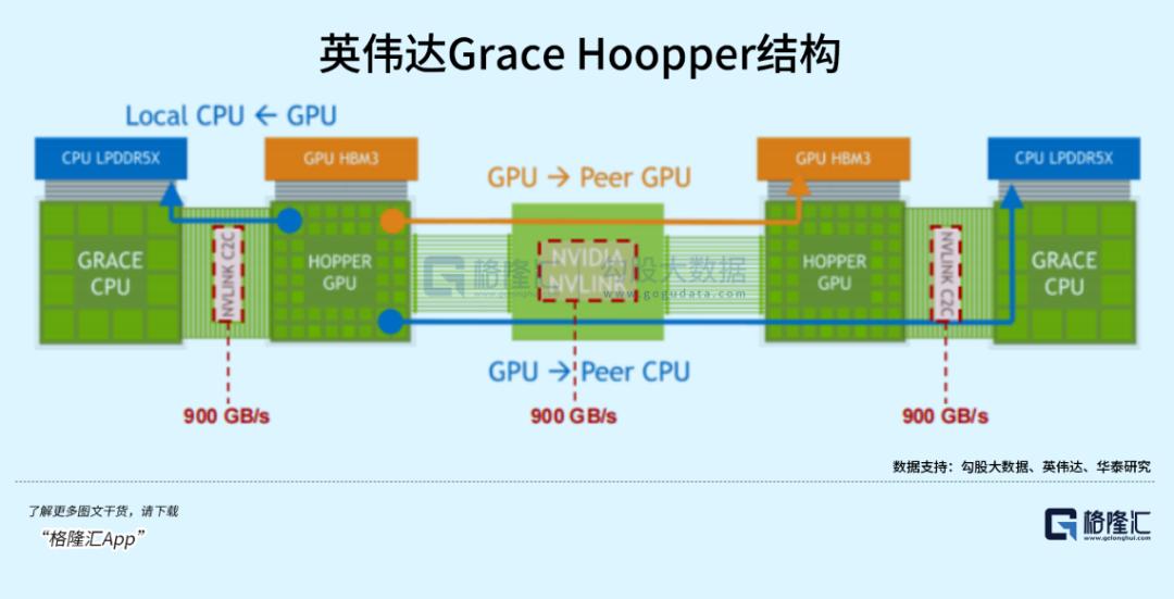 Grace Hoopper通过NVLink-C2C和NVLink Switch实现CPU-GPU和GPU-GPU互连,双方作为内存共享对等体可以直接访问对方的对应内存空间,支持900GB/s,高达150TB的高带宽内存访问,有效解决GPU大规模并行运算中“单节点本地内存不足”的痛点,优势要更突出一些。