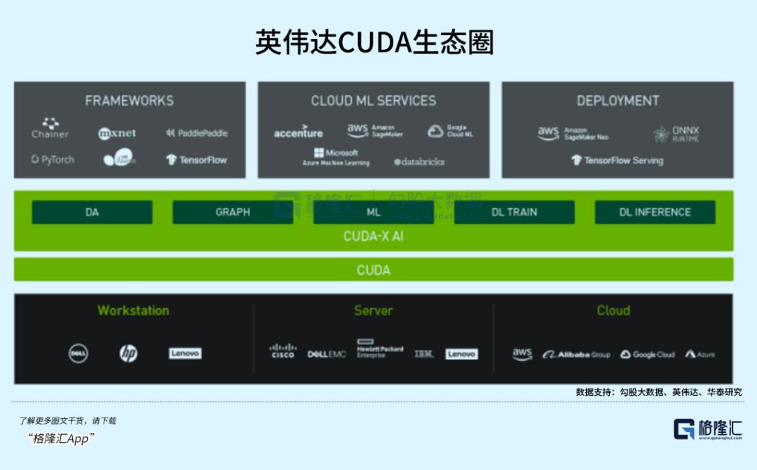 MI300在规格性能上或已十分接近英伟达领先算力的标准,但后者真正的杀手锏,是经过长期耕耘,积累了先发优势的CUDA生态圈,搭配芯片。其实参考微软操作系统和Office生产工具的组合就能够理解,一个不断完善的软件生态会提高用户粘性,形成正向循环,进一步的迭代同时提高了转换成本。英伟达全球CUDA开发者在2020年已经达到了200万,2023年实现翻倍。