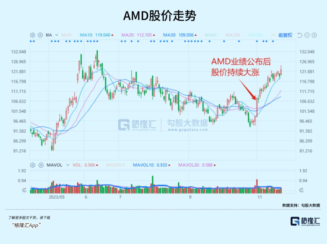 因为强劲的业绩指引,AMD在发布业绩后,AMD股价周三收盘大涨9.7%,并在此后数日持续上涨。