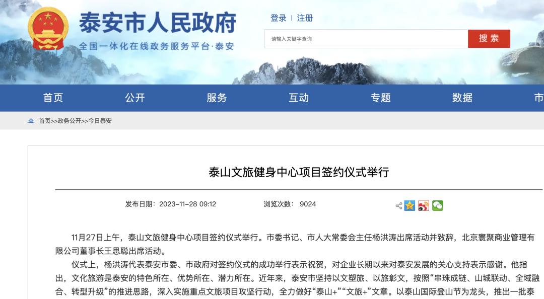 据泰安市人民政府网消息,11月27日上午,泰山文旅健身中心项目签约仪式举行。泰安市委书记、市人大常委会主任杨洪涛出席活动并致辞,北京寰聚商业管理有限公司董事长王思聪出席活动,双方签署项目合作协议。