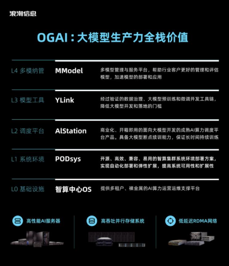 它包括L0的基础设施层(智算中心OS)、L1的系统环境层(PODsys)、L2的调度平台层(AIStation),L3的模型工具层(YLink)和L4的多模纳管层(MModel)。各层对应不同的应用场景,且分层解耦,用户需要哪些工具,就能调用哪些。