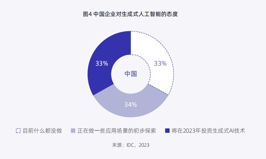 IDC和浪潮信息发布的《报告》,也从数据层面印证了这一点——67%的中国企业已经开始探索生成式AI在企业内的应用机会或进行相关资金投入。