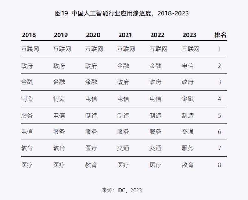 可以看到,在2023年人工智能行业渗透度排名中,Top5的行业依次为互联网、电信、政府、金融和制造。交通、服务、教育等行业在人工智能领域的投资力度也可圈可点,分别位列第六至八名。