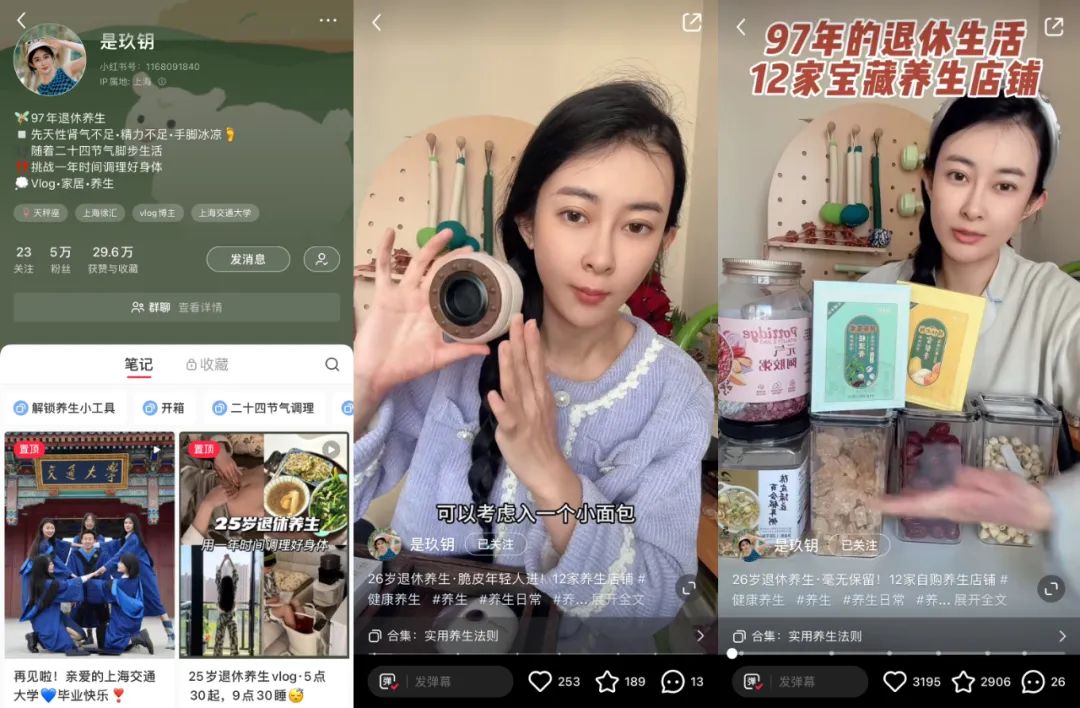 卡思认为,能够开出这么高的报价,是因为博主有3个核心优势: 以“上海交通大学毕业+25岁退休养生”为人设 ,引起观众好奇,制造记忆点; 内容精致且有干货,每一条笔记解决一个问题 ,比如《泡脚的六个误区》《艾草锤的六大用法》《体弱女孩如何调理脾胃》就是在解决常见话题里的痛点,皆成了爆款笔记; 走复合型路线 ,在垂直赛道外叠加了其他元素,即“养生+家居+vlog”路线,增加了账号的可看性和趣味性,便于吸引用户持续观看,也拓宽了商业合作范畴。
