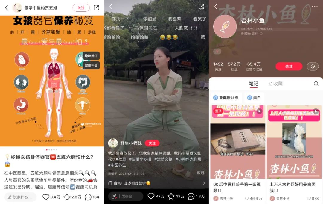 类似的账号还包括@偷学中医的贺五姐,该账号从年轻人的健康痛点出发,纯做图文内容,没有真人出镜,已输出136条笔记,吸粉7.5万;@野生小师妹 则是以活泼搞笑女的人设,来分享八段锦锻炼视频,吸引了很多用户喜爱,积累了10.1万粉丝;@杏林小鱼 以00后女生做中医科普的路线迅速打开账号声量,仅发布6条笔记就涨粉至57.2万。