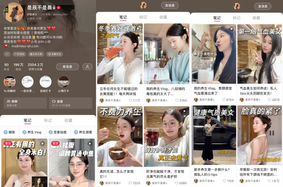 比如,@是辰不是晨ii 作为小红书头部博主,就靠分享养生干货,狂揽196万粉丝,日常笔记点赞也常常过万,比如《立冬任何女生不能错过的去黄搭配》《气血美女如何养成!私人tips从头到脚都在发光》等,就是从饮食角度介绍自己的养生和美容心得,由于博主本人有着饱满紧致的面庞,其视频说服力也进一步此增强,十分容易获取粉丝信任。