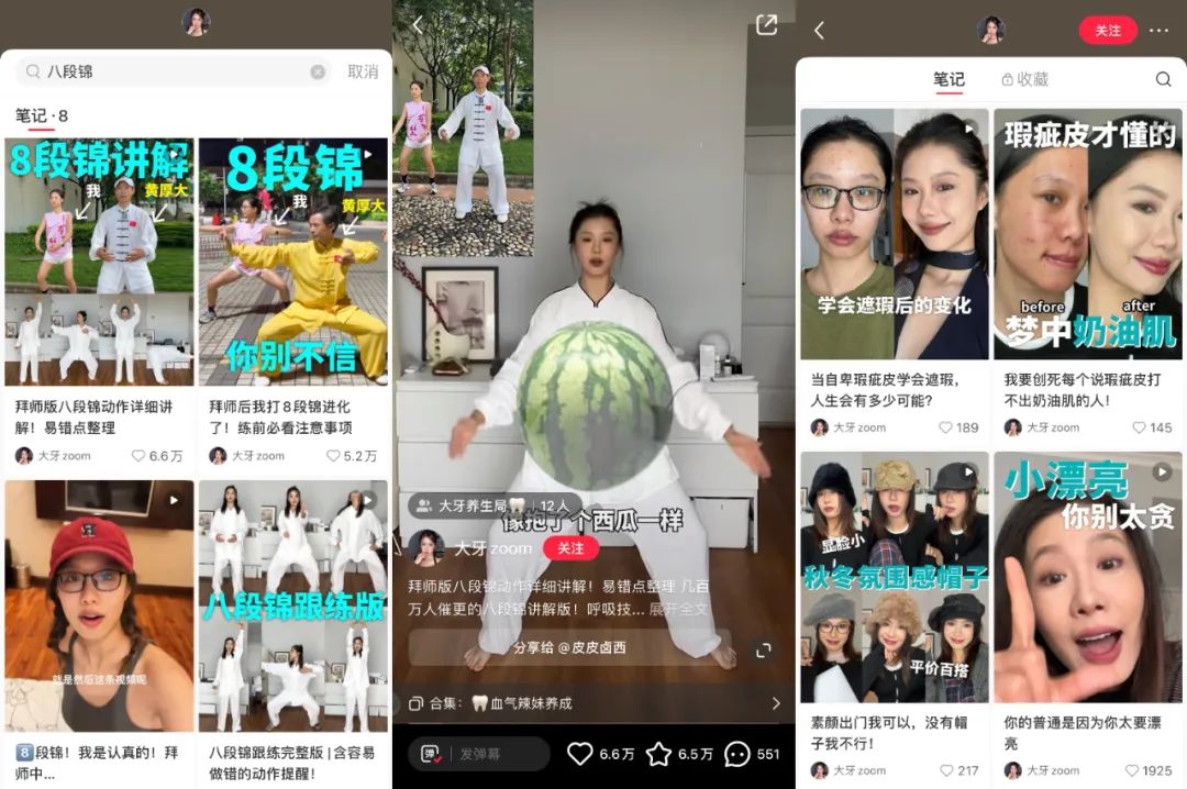 在小红书,美妆博主@大牙Zoom 今年发布了8条八段锦相关视频,热度都不算低,她也因此戏称自己是“八段锦博主”。 比如,视频 《拜师版八段锦动作详细讲解! 易错点整理》成了爆款作品,点赞达到6.6万、收藏6.5万; 《拜师后我打八段锦进化了!练前必看注意事项》的点赞量也突破5万、收藏达2.7万。与之相对, 其大部分美妆笔记的点赞则在200-1000左右。