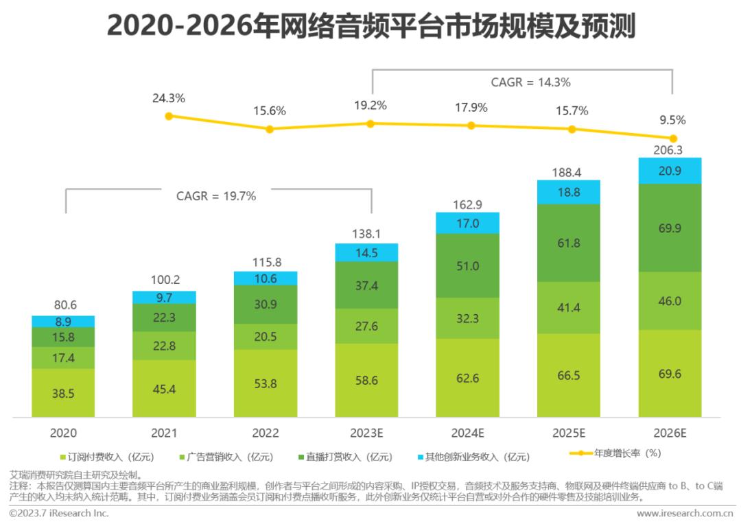 根据艾瑞咨询发布《2023年中国网络音频产业研究报告》,在线音频平台2021年市场规模仅为100.2亿元,2022年为115.8亿,2023年预估为138.1亿,行业增速从2020年之前的超过20%,下滑到20%以下。2026年,行业增速或将下滑至9.5%。