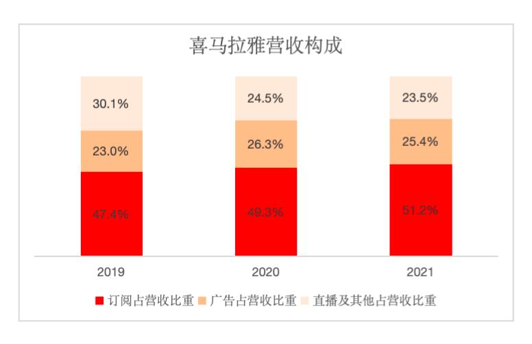 值得注意的是,翻看喜马拉雅2019年到2021的业绩,付费率不高的用户订阅业务,占据营收的比例在50%左右,是真正的收入支柱。