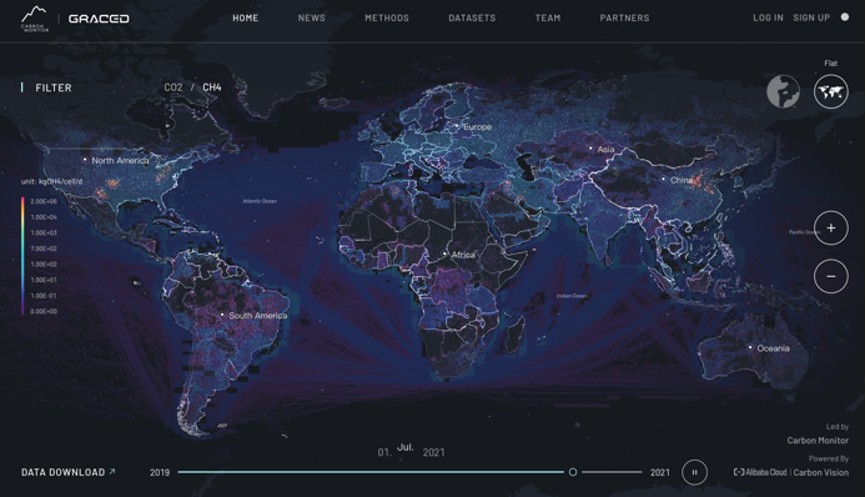 在此背景下,由清华大学地球系统科学系以及多个国家的研究机构和业内专家组成的Carbon Monitor团队,与阿里云团队合作,在COP28上发布了“甲烷地图”——GRACED全球近实时甲烷地图网站,提供近实时更新、8天尺度、全球覆盖的化石燃料甲烷排放网格数据。
