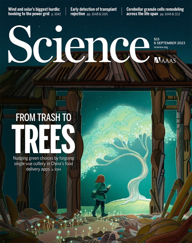 《科学》杂志封面论文,该论文基于饿了么平台改动餐具选择用户界面这一绿色助推实践,研究了其对于一次性餐具消费和减少塑料垃圾的影响。