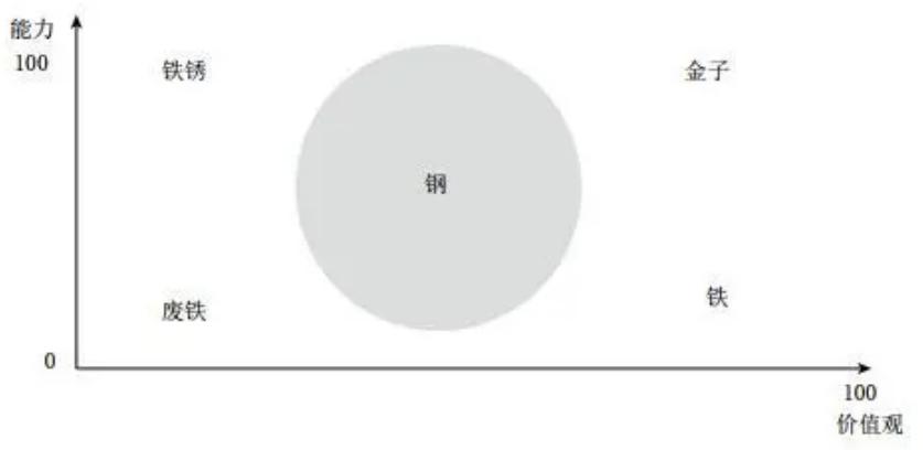 64.我们招聘管培生、选人、用人、留人、升职、加薪、辞退主要就看下面这张表。把考核指标分为两个维度量化的话,从0分到100分,一条是能力线,一条是价值观线。