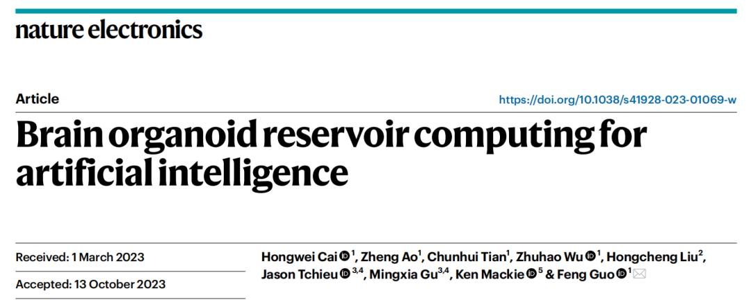 相关研究论文以“Brain organoid reservoir computing for artificial intelligence”为题,已发表到 Nature 子刊 Nature Electronics 上。