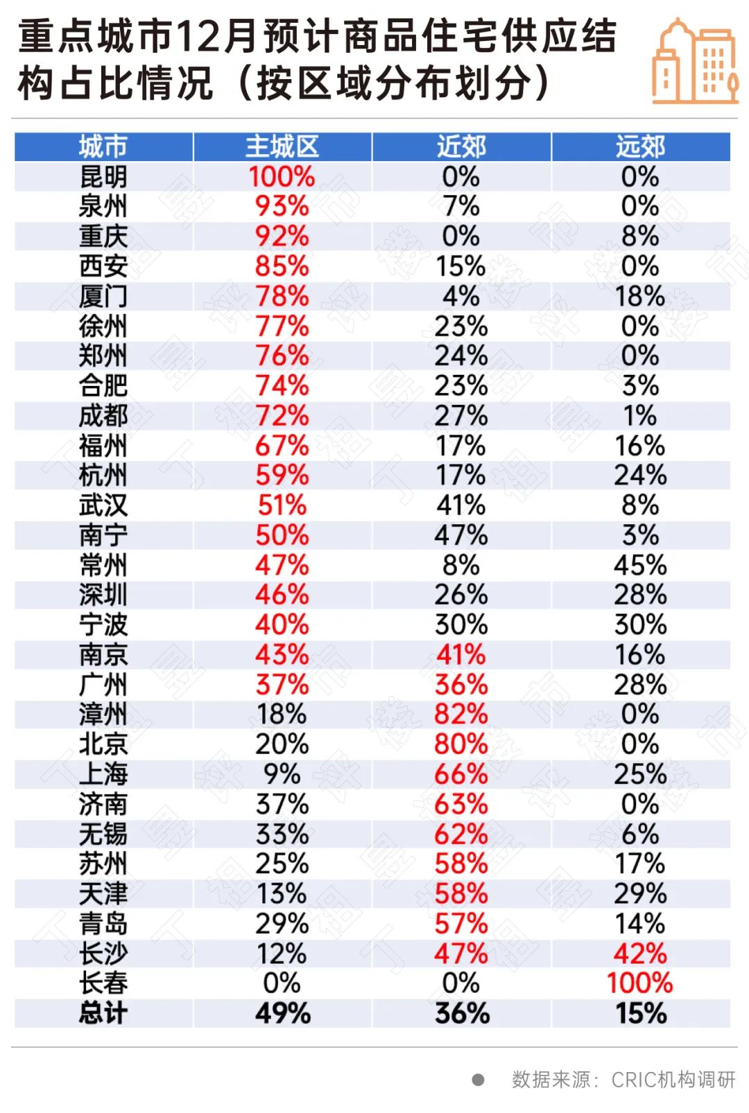 从供应结构各项目区域分布来看,重点城市主城、近郊、远郊占比结构为49%、36%和15%,与上月的供应结构基本驱动,整体供应重心仍集中在主城区,近郊次之。